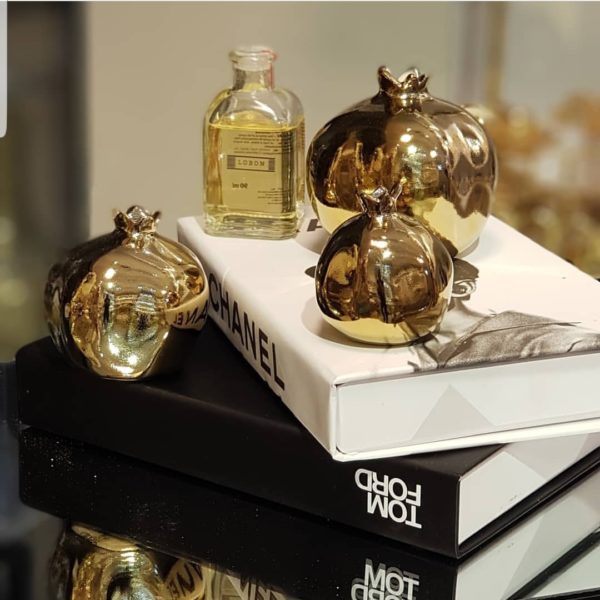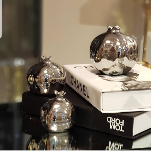 میوه های سرامیکی انار در رنگهای طلایی و سیلور همچنین میوه های تولید شده از قبیل موز آناناس سیب گلابی در بسته بندی جدید آماده ارائه به مشتریان.